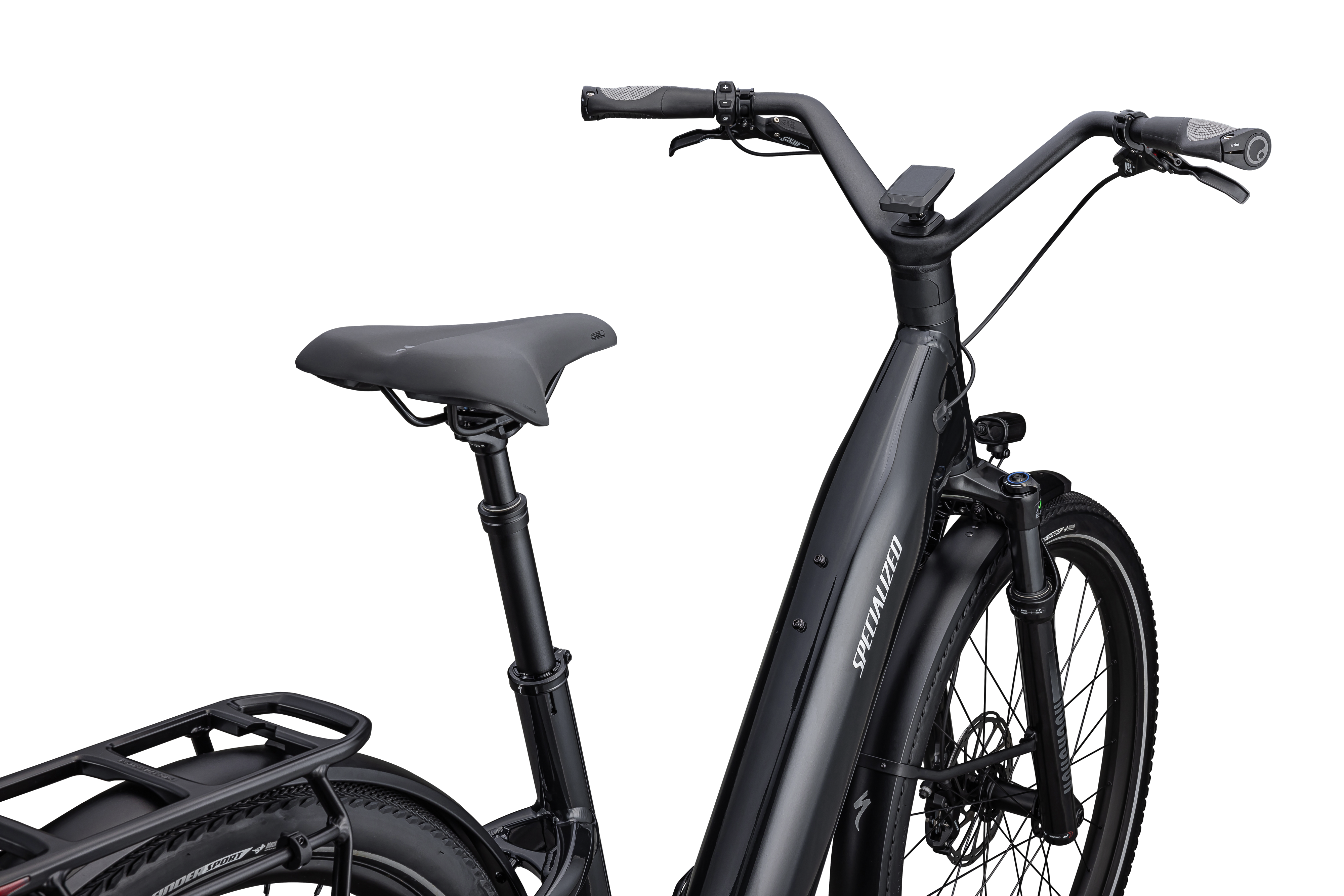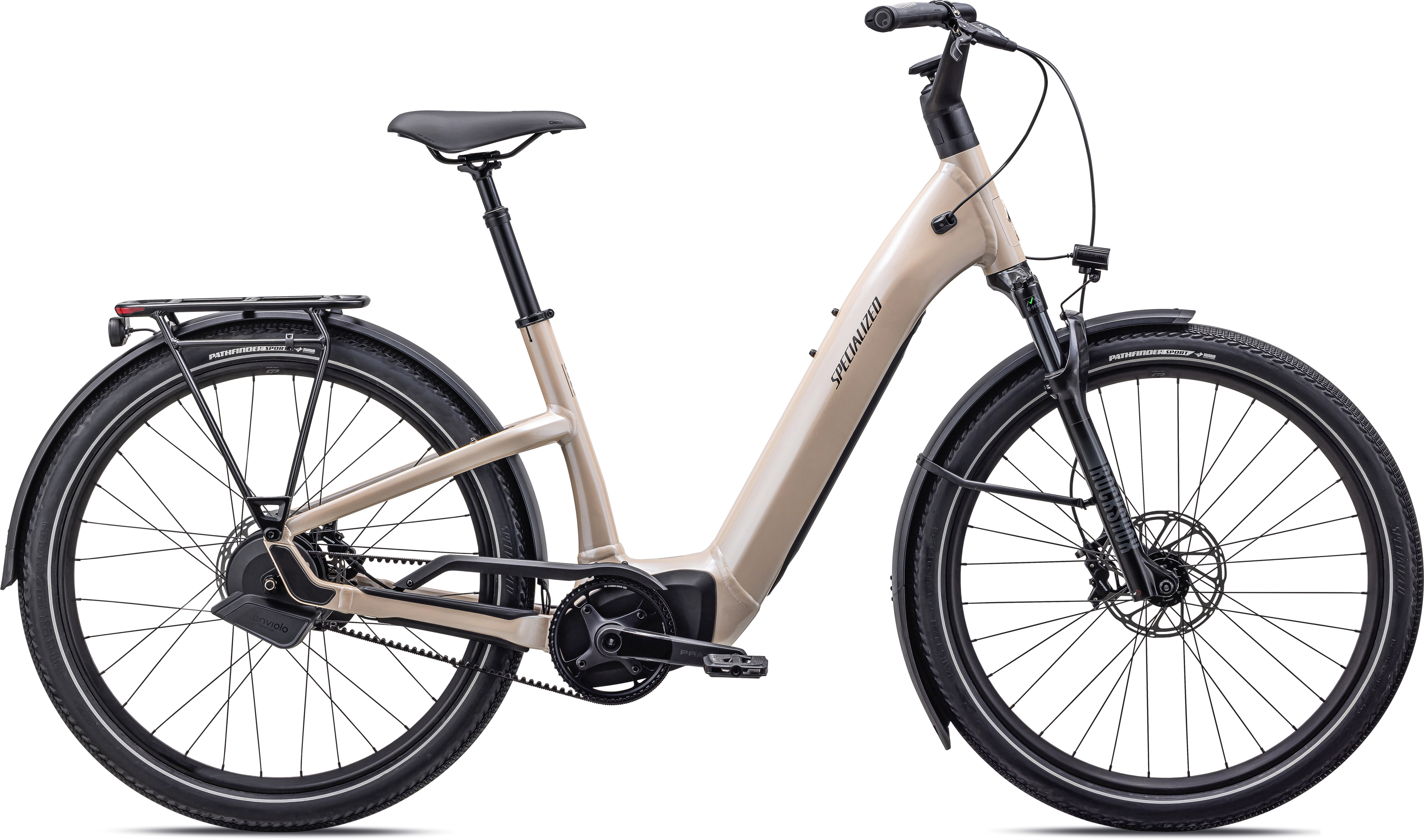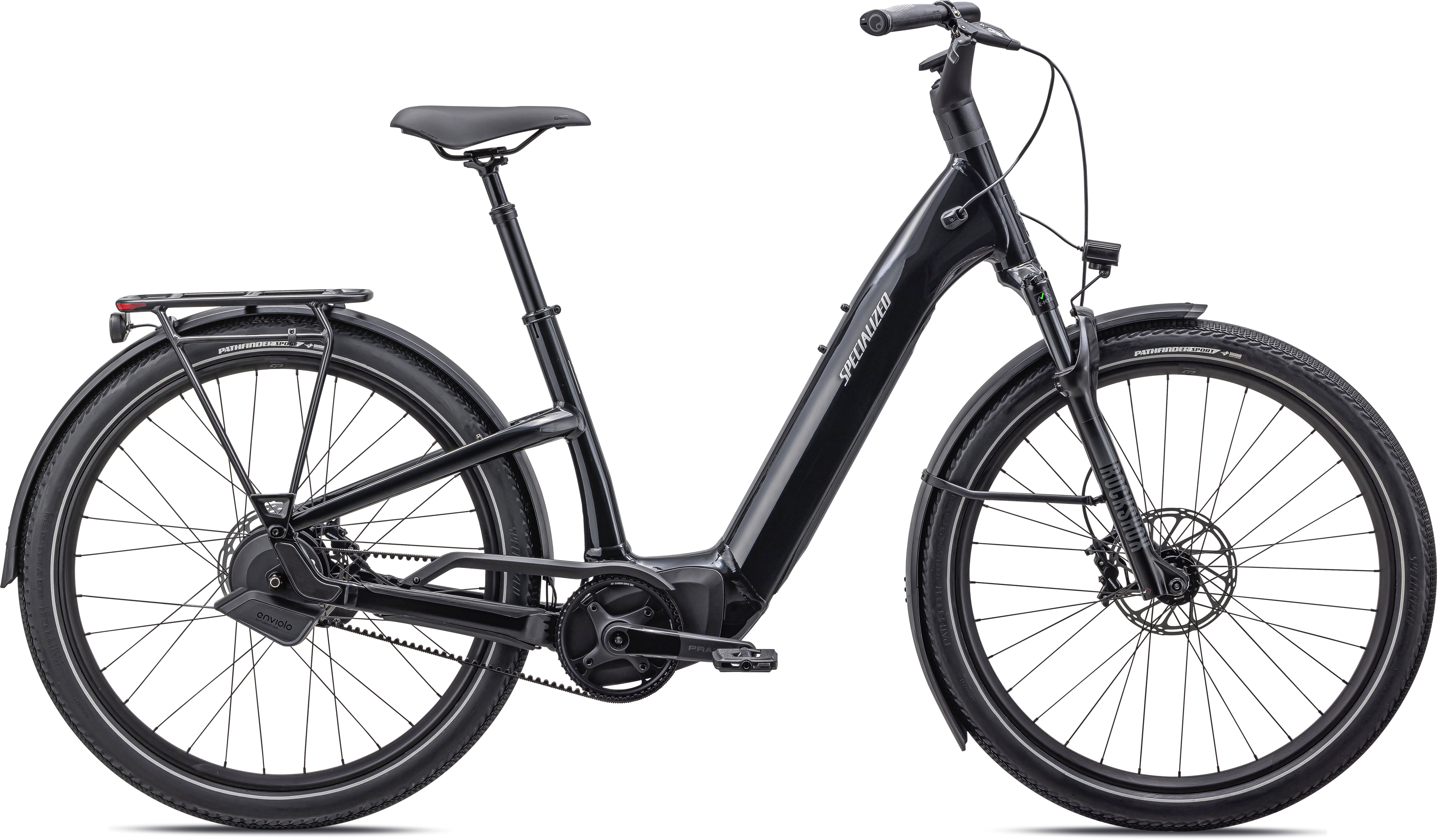 E5 Aluminum, bottom bracket motor mount, fully integrated &lockable downtube battery, internal cable routing, lock and front rack mount, sliding dropout