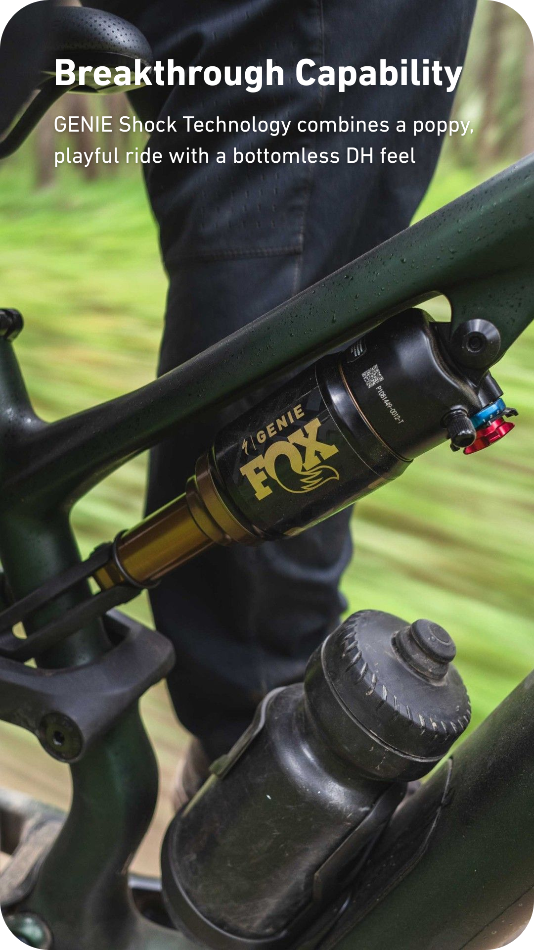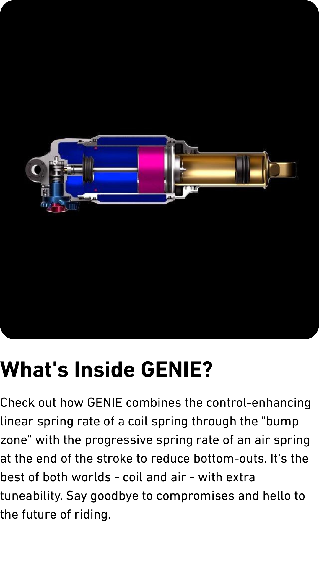 ILLUMINATING GENIE: GENIE combines the control-enhancing linear spring rate of a coil spring through the “bump zone” with the progressive spring rate of an air spring at the end of the stroke to avoid bottom-outs. Truly, it's the best of both worlds – coil and air – with extra tunability. Say goodbye to compromises and hello to the future of riding.