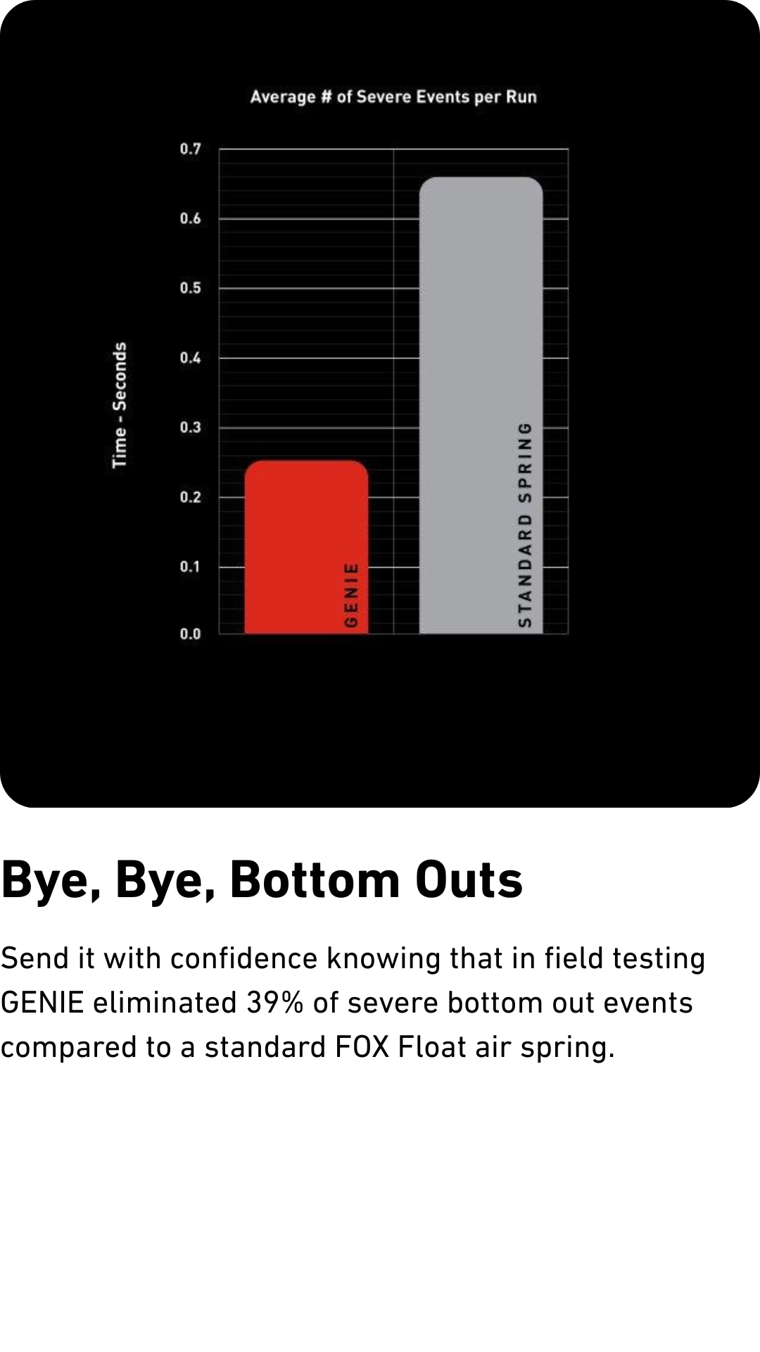 BYE, BYE, BOTTOM-OUTS: 39% fewer bottom-outs than a standard air spring. During big hit events, you benefit from the rising rate in the last 30% of the GENIE stroke. Because of this two-stage, pronounced rising rate, GENIE reduces the frequency and severity of bottom-outs.