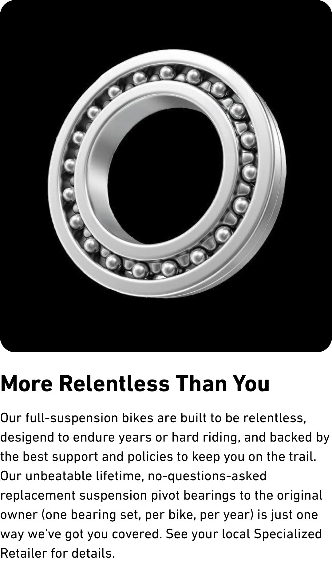 MORE RELENTLESS THAN YOU: Our full-suspension bikes are built to be relentless, designed to endure years of hard riding, and backed by the best support and policies to keep you on the trail. Our unbeatable lifetime, no-questions-asked replacement suspension pivot bearings to the original owner is just one way we've got you covered.