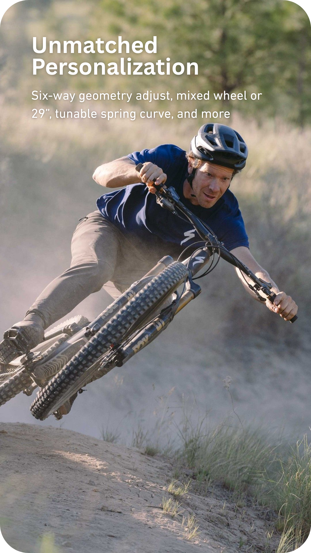 UNMATCHED PERSONALIZATION: Six-way geometry adjustment, mixed wheel or 29”, tunable spring curve, and more.