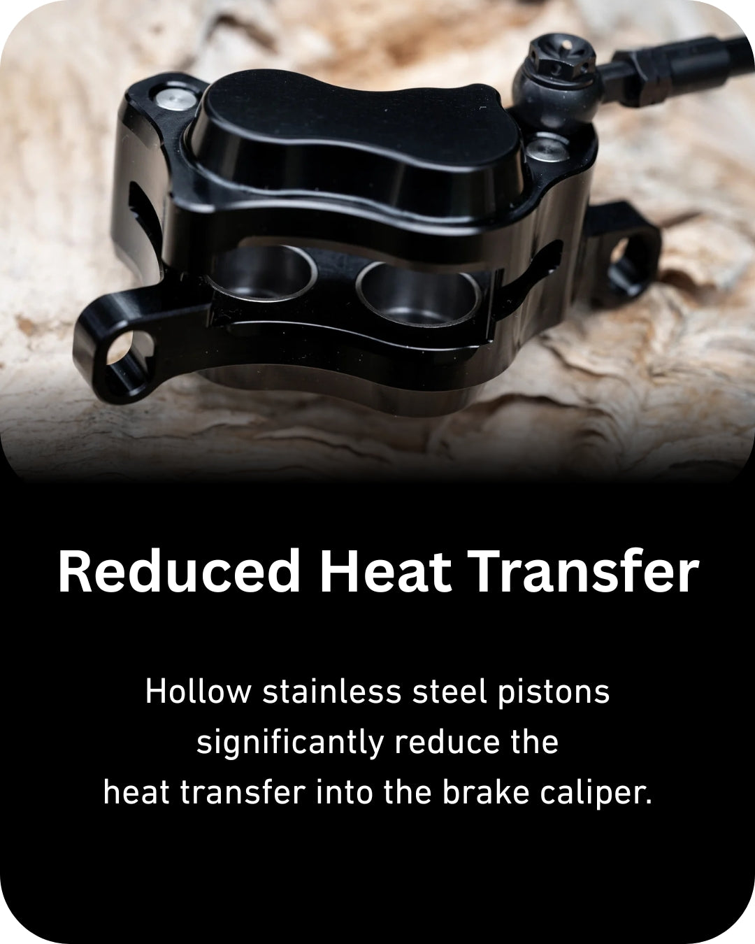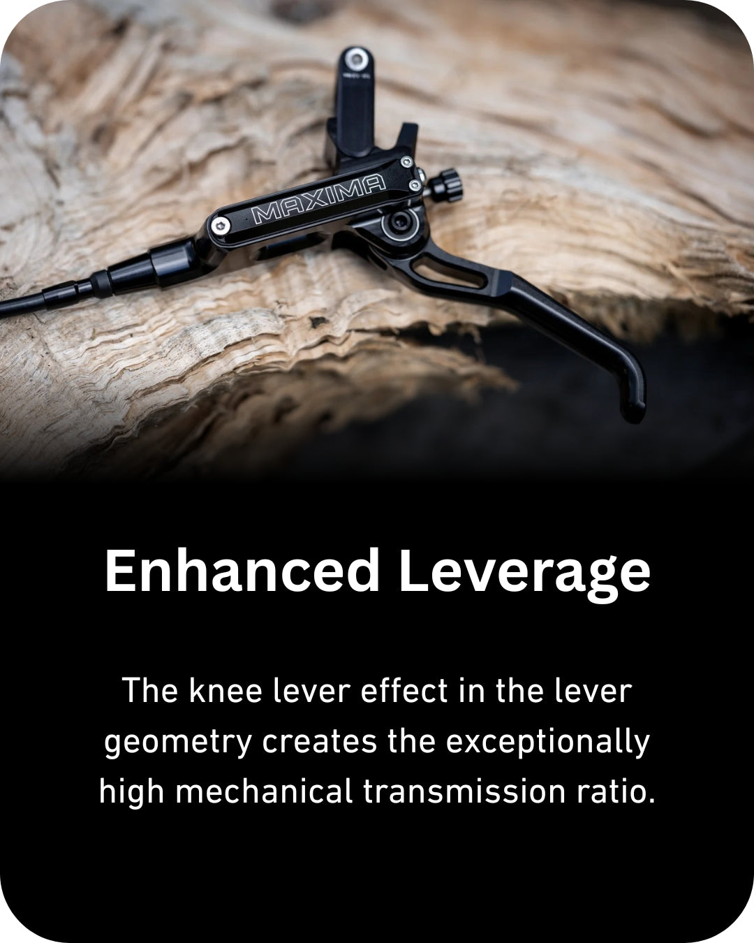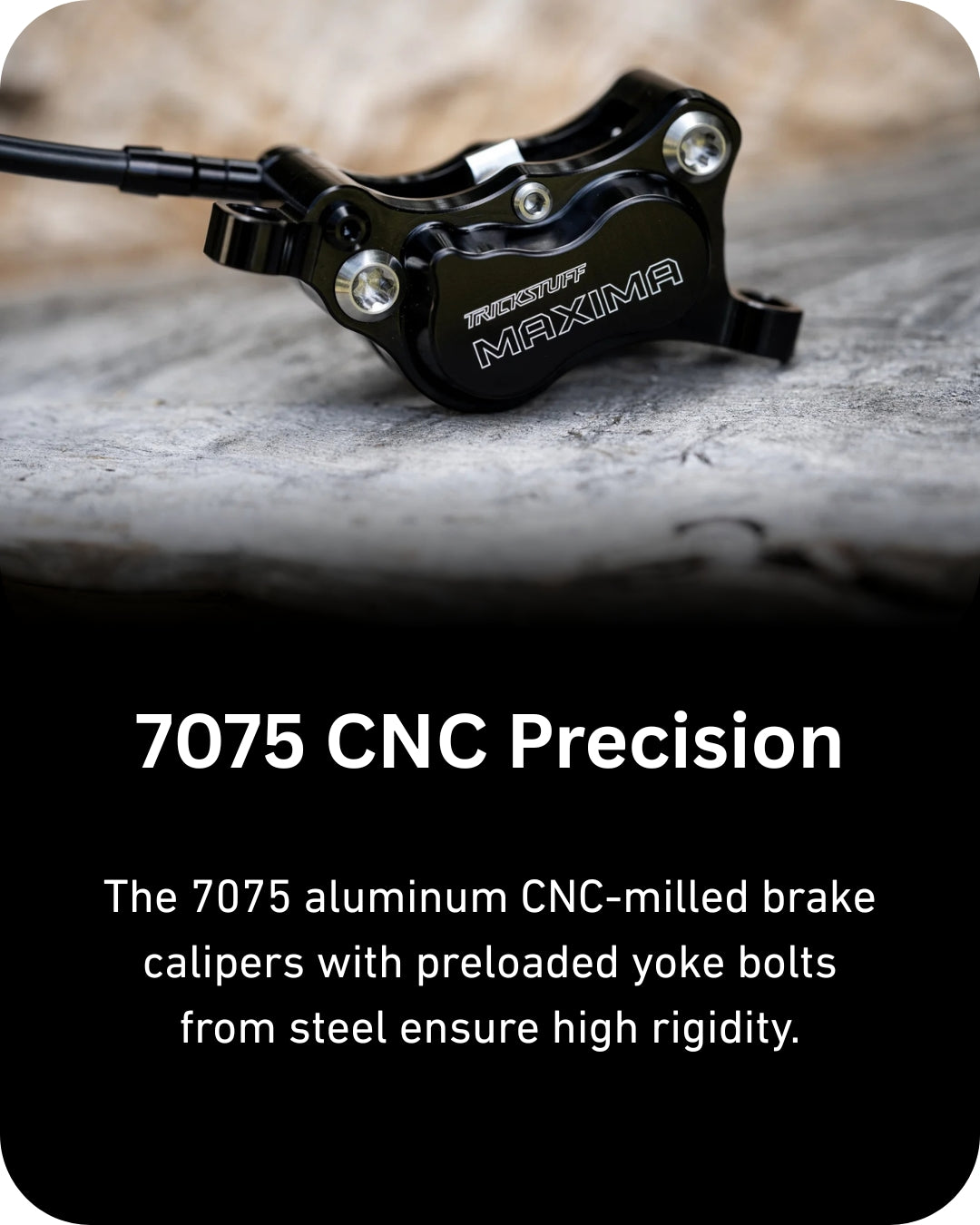 On the steepest and roughest tracks, where the cocktail of stress hormones and endorphins blur your judgement, it is crucial to remain composed. The MAXIMA is developed for this balancing act at your own limit with one goal: pushing the boundaries in terms of braking power and controllability. There is a docile nature to the MAXIMA that may not initially be obvious. The smooth operation of the mechanism ensures a consistently predictable bite point and allows the braking force to be modulated down to the finest degree, maintaining control in even seemingly unrideable sections. This fidelity is crucial to harness the ludicrous power of the Maxima, waiting to be awoken. Its enormous strength results from the hydraulic transmission of the 9mm pump piston to four 16/17mm caliper pistons and the exceptionally high mechanical transmission ratio created by the lever. The exceptionally high mechanical transmission ratio due to the lever geometry minimizes the finger force required even on the steepest chutes. The 7075 aluminum CNC-milled brake calipers with optimized steel yoke bolts ensure high caliper stiffness. In combination with the Goodridge steel flex or Kevlar hoses installed, this results in the enormous rigidity of the overall system, which keeps the power in check. The balance between control and braking power is at your fingertips. So, are you ready to poke the bear?