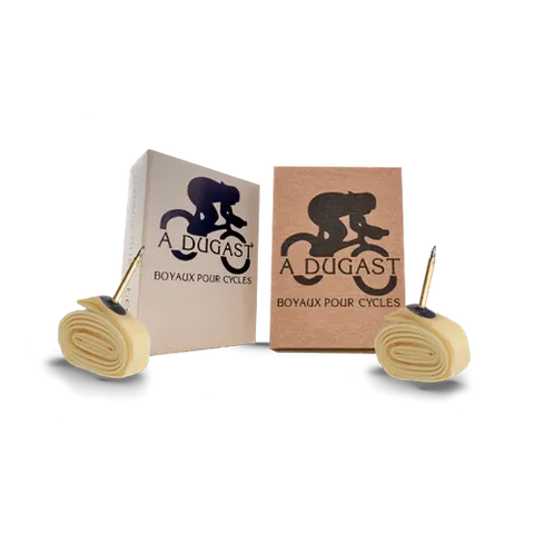 Made in the Netherlands, A. Dugast latex tubes are made out of 100% natural latex. Latex tubes are stronger, suppler, more comfortable, more puncture resistant and have a lower rolling resistance than butyl inner tubes. A Dugast latex inner tubes are available in 51.5mm valve length option (42 mm only on request) and use Presta valve mechanism only. The latex tubes for clinchers are exactely the same as the ones glued in tubulars. A Dugast latex inner tubes are very thin (0.5 - 0.6 mm) as they are high performance tubes, so they do not use any inner braker or additional layer.